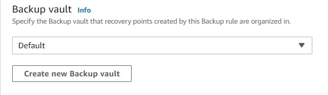 - At this step, you should select the backup vault for storing your recovery points (the ones created by this Backup rule). You can click Create new Backup vault if you want to have a new customizable vault. You can also use the existing Backup vault if you have one. Alternatively, you can choose the default AWS Backup vault.