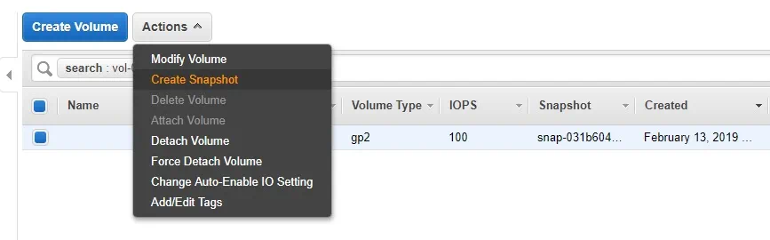 - The Volumes section should open. Click Actions and select Create Snapshot.
