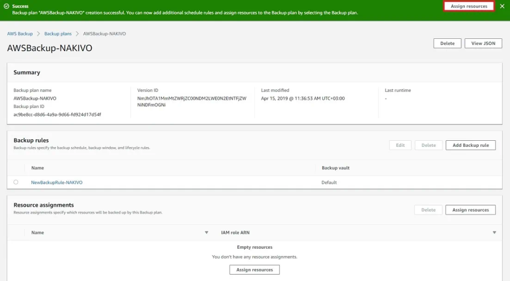 - Your backup plan has been successfully created. However, before you can run this plan and deploy it in your environment, you should also assign resources which need to be backed up. Click the Assign resources button, which can be found in the top bar.