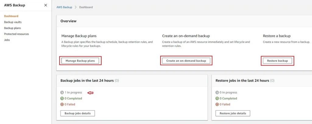 As you can see, our backup job is already in progress. In this menu, you can also Manage Backup plans, Create an on-demand backup, or Restore backup. Choose the required option and set up another data protection job in AWS environment following the prompts.