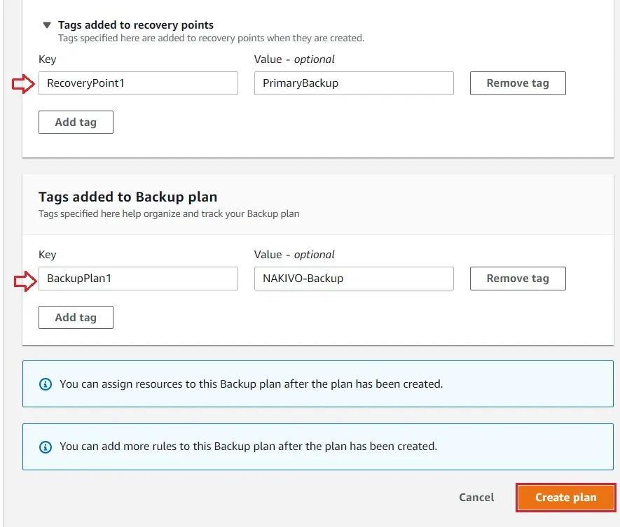 - Next, you must add tags to recovery points and your backup plan in order to organize them and easily monitor their current status.